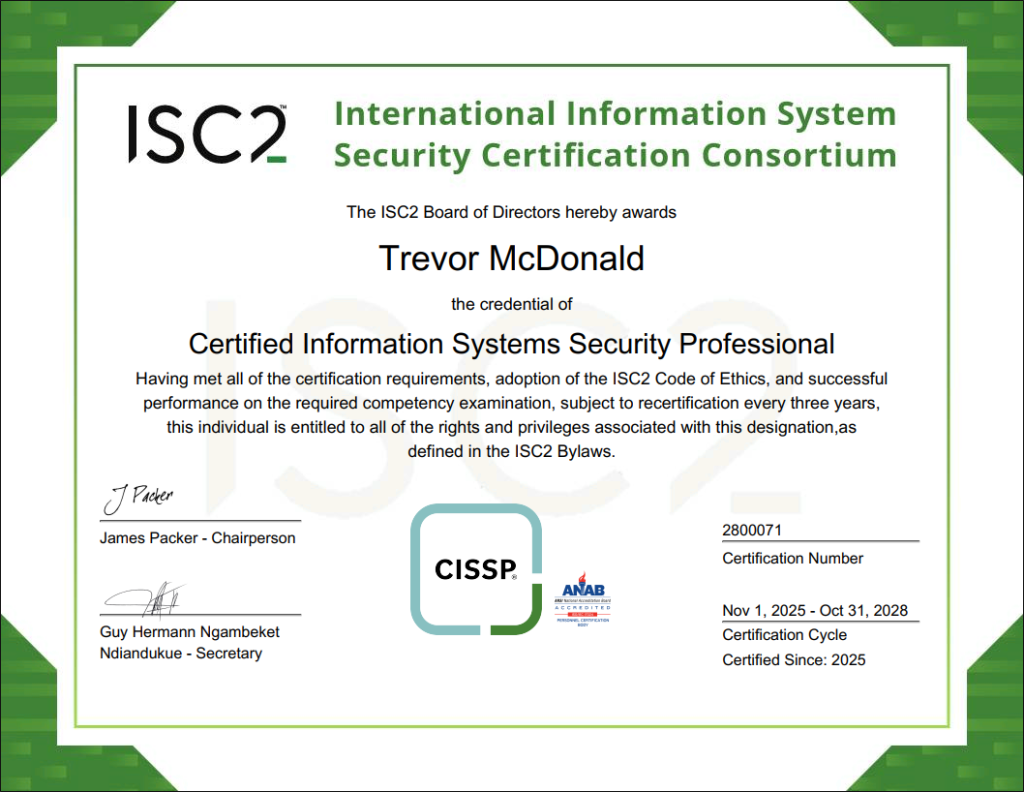 So that’s my life story, or at least the infosec parts. I officially received my CISSP approval today (October 24, 2025), which sort of prompted the creation of this site and this writeup. There’s only so much you can put into a resume and cover letter, so I figured this could provide some context for anyone who is interested. It also was nice to reminisce about some of those periods of my life.